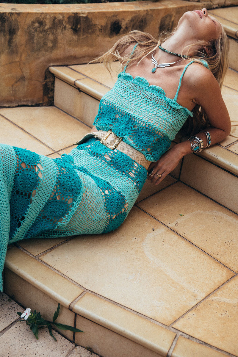 As you know, we love our 70s crochet styles and this is our version of the perfect sundress - timeless, beautiful summery and fun! The crochet motif is so ornate and exquisite and the colour palate looks like a tropical reef.