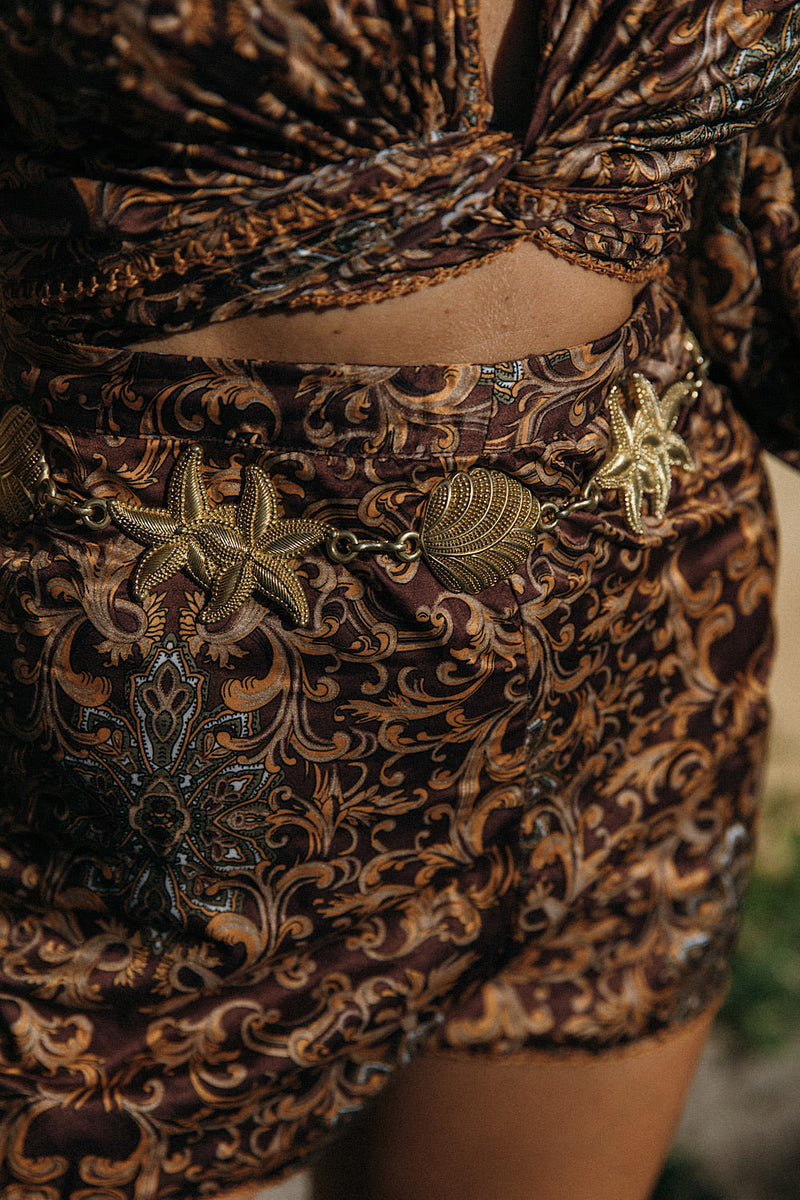 This waist belt features beautiful hand cast brass starfish and abstract shells and it adds a dose of glam and the coolest summery, beach vibe to any look! It’s the kind of statement piece that takes every outfit to the next level! We find ourselves styling with this one incessantly.