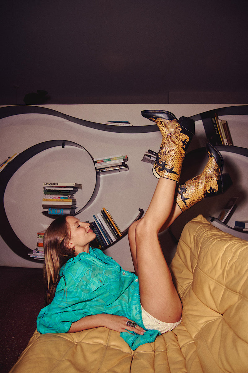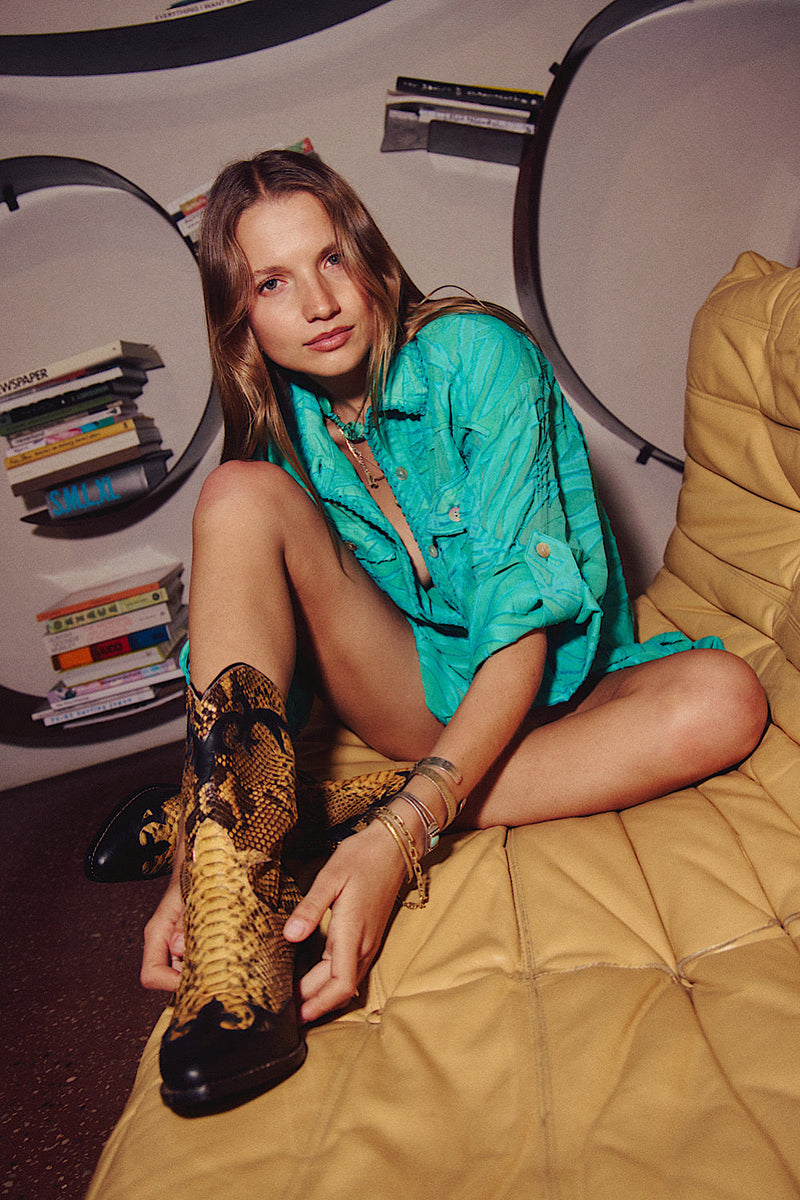 Not your average western. These boots channel rebel energy with a vintage twist — crafted in textured snakeskin-embossed leather with deep black overlay and a sturdy stacked heel. Finished with curved top edges and stitched pull tabs, they hit that perfect balance between wild and wearable.