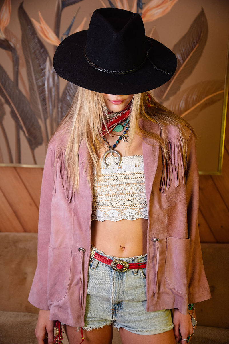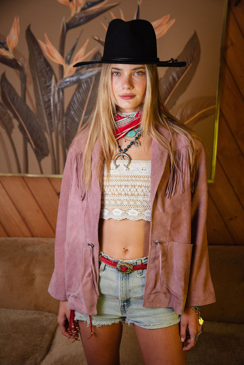 A jacket to fall in love with, crafted in the softest faded rose suede and finished with swaying fringe that moves with every step. Designed with wide front patch pockets and a tie-front waist, it has that perfect lived-in feel and vintage Western edge we adore.