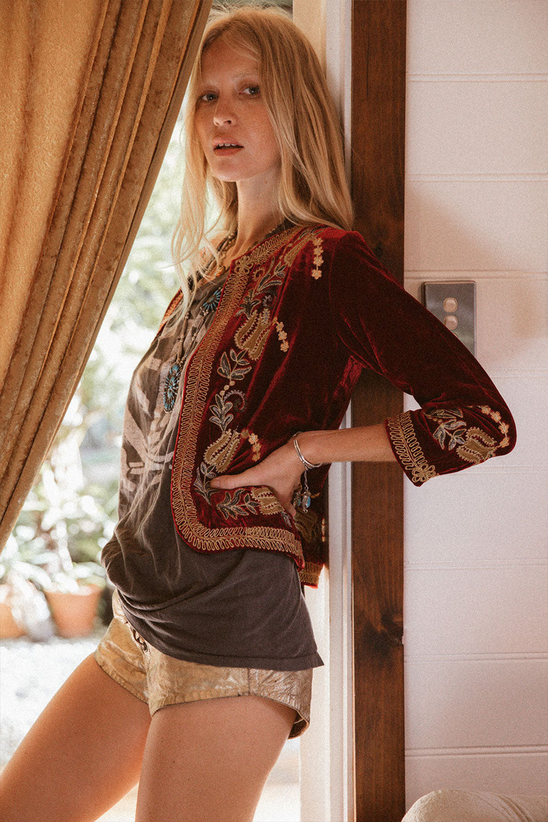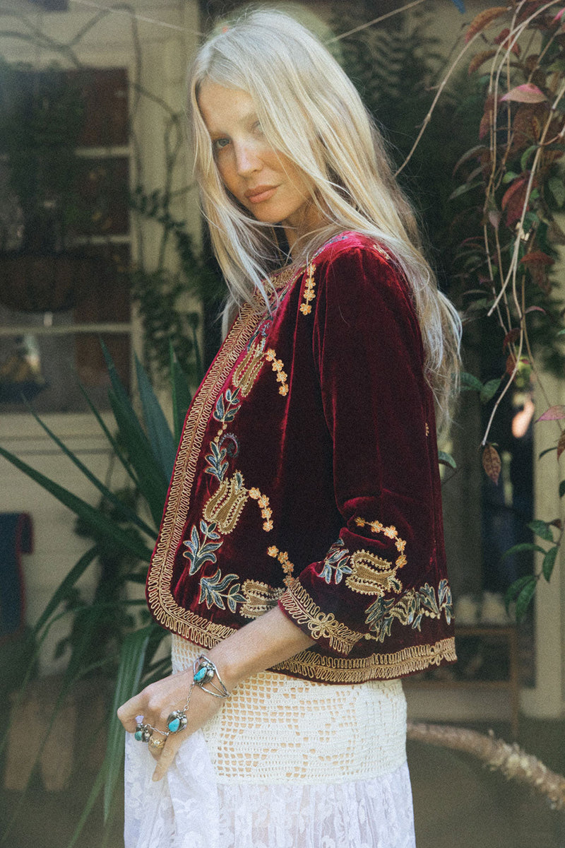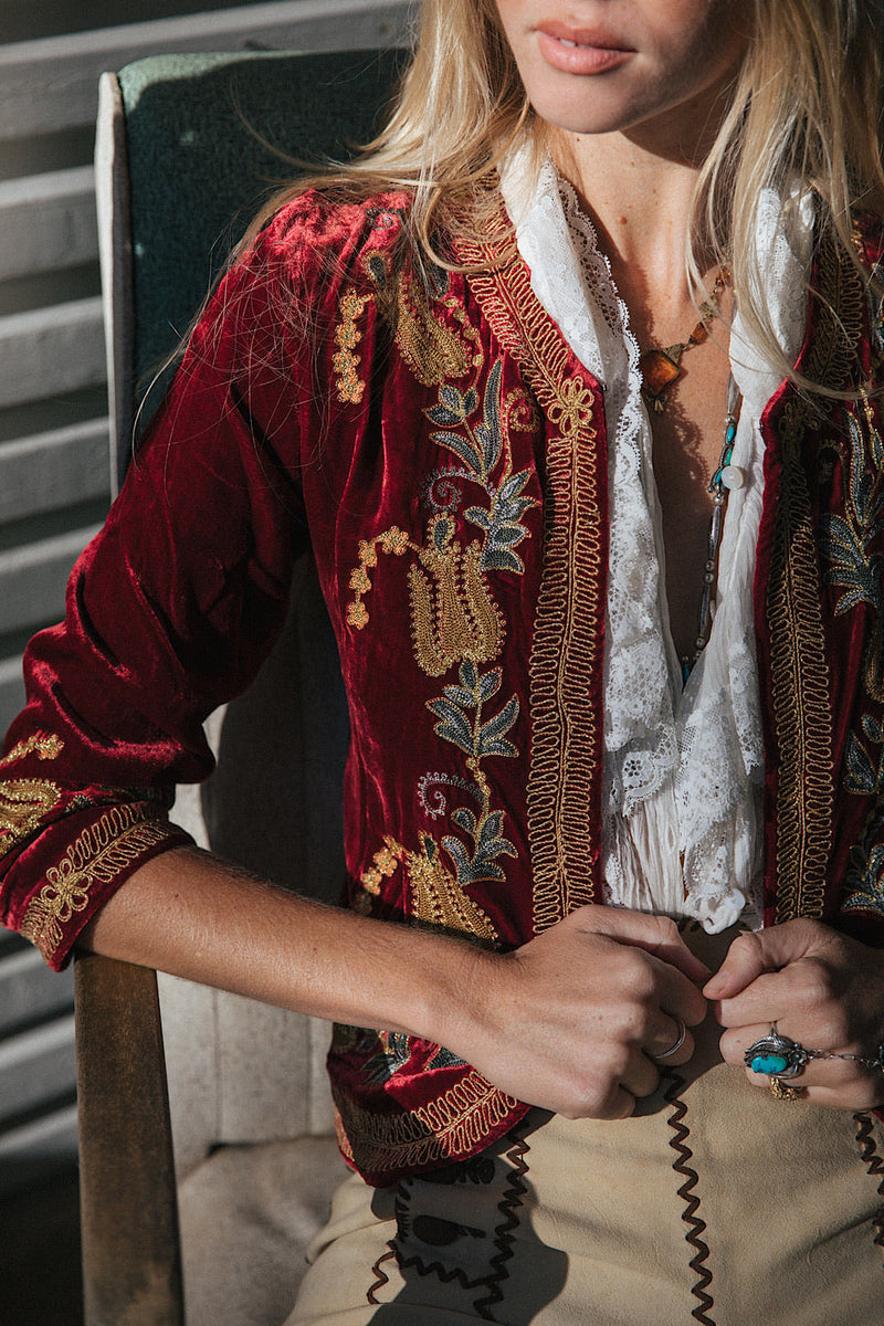 We’re so excited to bring you another few of this incredible silk velvet jacket! This one is phenomenally beautiful with its intricate chainstitch embroidery and soutache embroidery edging. This is that investment piece that you will treasure forever and will turn heads every time you wear it- whether you toss it on over a simple white tee and your favourite jeans or go all out and layer it over a silk dress.