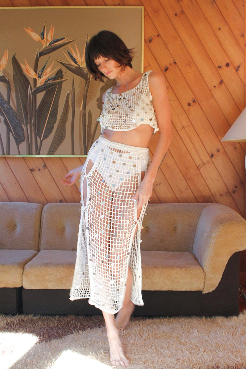 These are the most beautiful, striking set!! It’s got an edgy 90s feel and is the ultimate holiday or party outfit. It’s made from soft organic cotton hand crochet and embellished with light weight silver metal discs that give it ultimate impact.