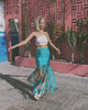 This skirt is breathtaking! Shimmering turquoise silk with gorgeous hand knotting adding intrigue and ankle skimming fringe swishing around as you move. It’s perfect for a formal event pared your favourite silk blouse or can be dressed down with a rock tee.