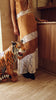 Made from panels of silk satin and delicate lace, it moves between textures in a way that feels both soft and striking. The warm golden satin catches the light while the lace adds contrast and softness through the body and hem.